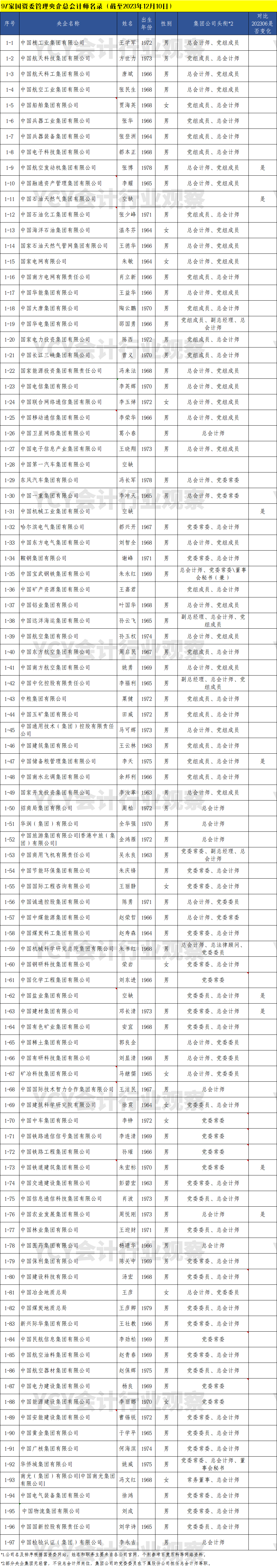 个别央企总会计师岗位目前是空缺状态。根据YCY会计行业观察采集自各央企官网,在目前一共有93位在职央企总会计师信息(详见下表)。
