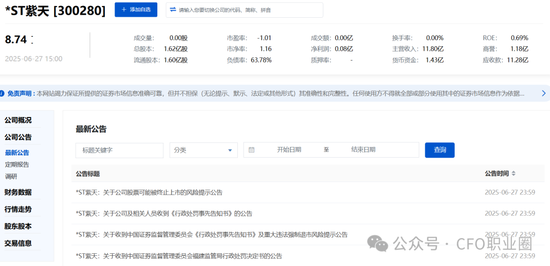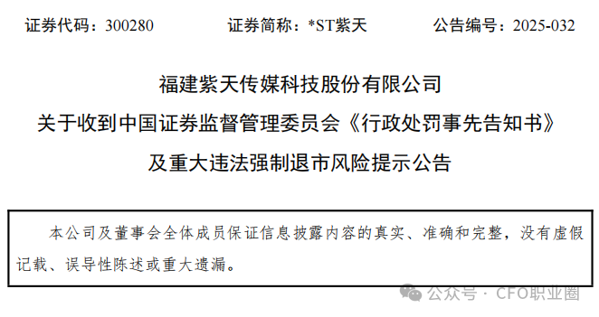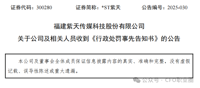 1、福建紫天传媒科技股份有限公司(以下简称“公司”或“紫天科技”)于2025年6月27日收到中国证券监督管理委员会福建监管局(以下简称“福建证监局”)下发的《行政处罚事先告知书》(闽证监函〔2025〕308号)(以下简称“《告知书》”),因涉嫌信息披露违法违规,已经福建证监局调查完毕,拟作出行政处罚。
